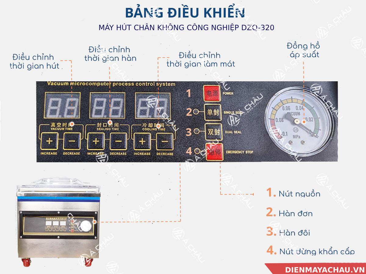 Bảng điều khiển máy hút chân không DZQ-320 chỉ gồm các nút bật/tắt, điều chỉnh thời gian, áp suất và dừng khẩn cấp do đó bạn có thể ghi nhớ dễ dàng, sử dụng được ngay mà không cần người hướng dẫn.