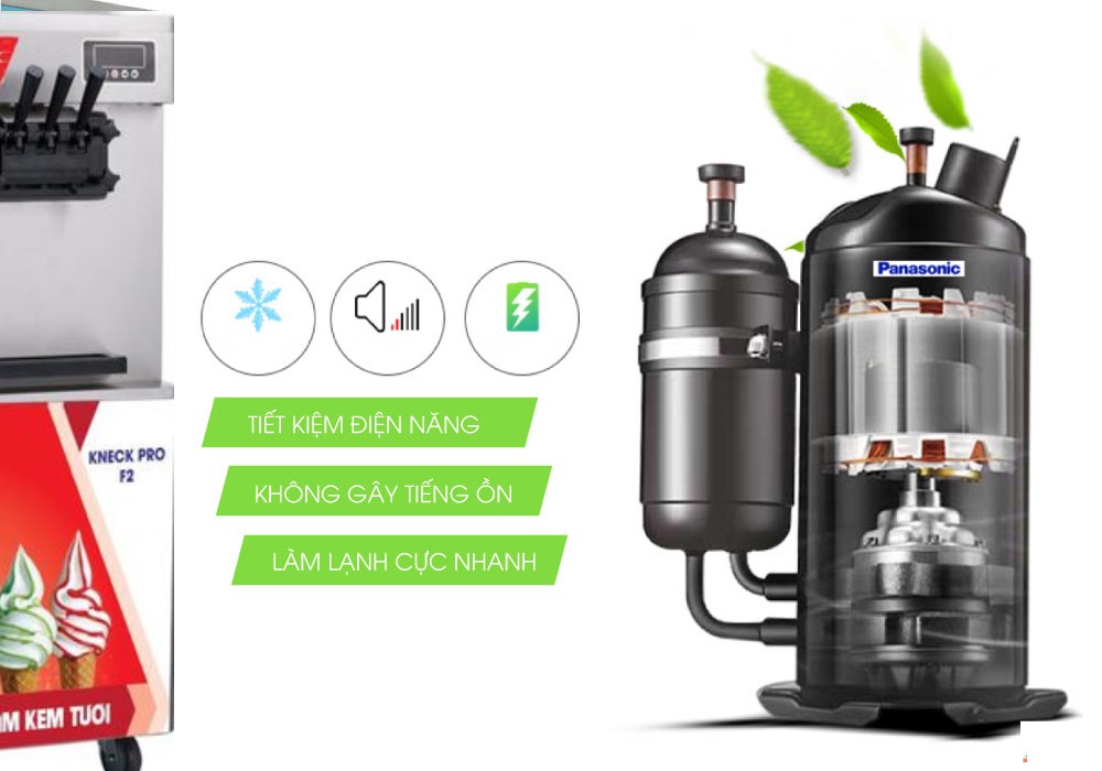 Đặc điểm của lốc Panasonic là làm lạnh tốt, giúp kem tươi mát, ngoài ra lốc vận hành êm ái, không gây tiếng ồn